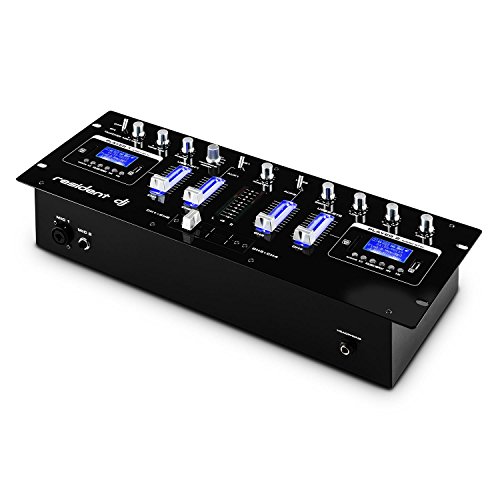 Tolle Optik zum guten Preis: Der resident dj DJ405USB 4-Kanal-DJ-Mixer ist ein echter Hingucker, der zudem mit einer guten Ausstattung und hohem Funktionsumfang beeindruckt. Das 19 Zoll Mischpult mit den Abmessungen von 48,3 x 9,2 x 17,6 Zentimetern ist für den festen Einbau konzipiert. Die großen, beleuchteten Regler und Knöpfe machen optisch viel her.